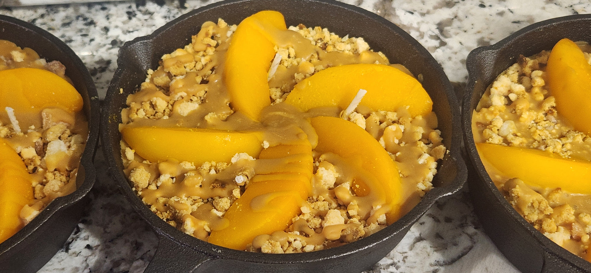 Yes, THIS peach cobbler-inspired, 3-wick candle is set in a real cast-iron skillet, with a jump start to your favorite holiday scents. If peach cobbler is one of your favorite holiday treats, you'll love the throw from this dessert candle. Limited Inventory. Candle will be shipped approximately 2 weeks after receipt of your order.